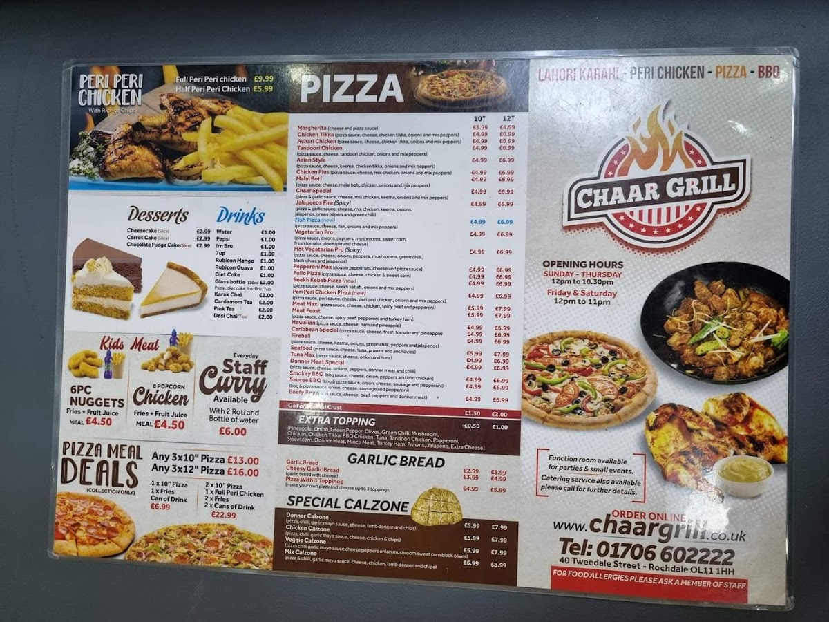 Introducing Chaar Grill, a hidden gem located at 40 Tweedale St, Rochdale. This vibrant eatery offers a mouthwatering menu that promises to tantalize your taste buds. Start your meal with their Garlic Bread, ranging from classic garlic to cheesy variations. Their customizable Pizza allows you to create your perfect blend with up to three toppings.